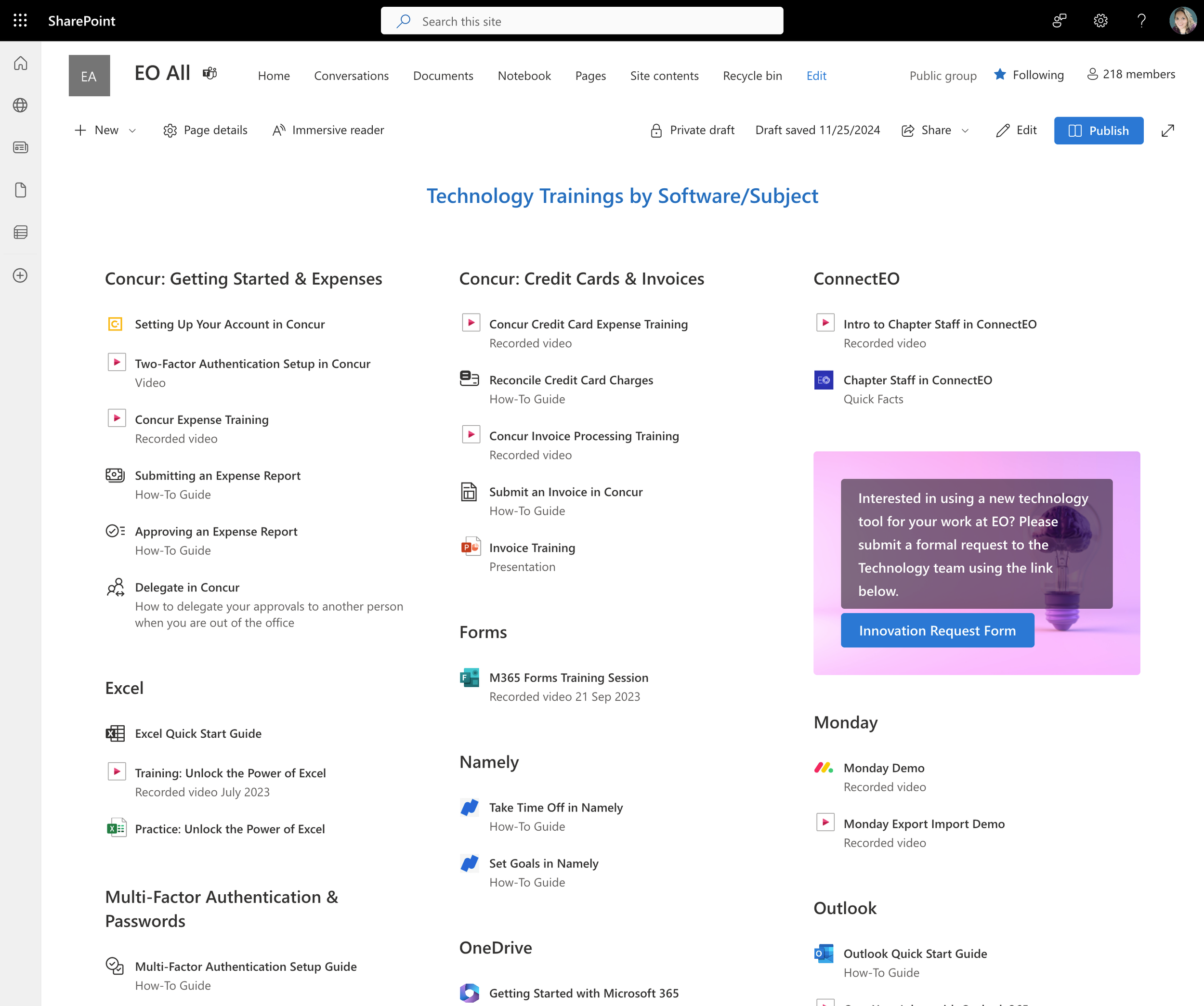 I offer intranet buildout or refresh services, including user surveys, knowledge base audit, site design and editorial, content.